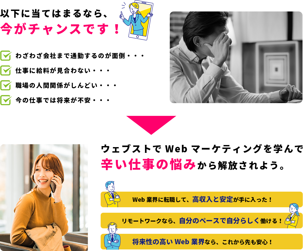 まずは副業でWebマーケティングを実践し、自分の力で収入を作る力を身につけます。本物の高単価案件で実務経験を積み、Web業界への転職・起業を叶えましょう!